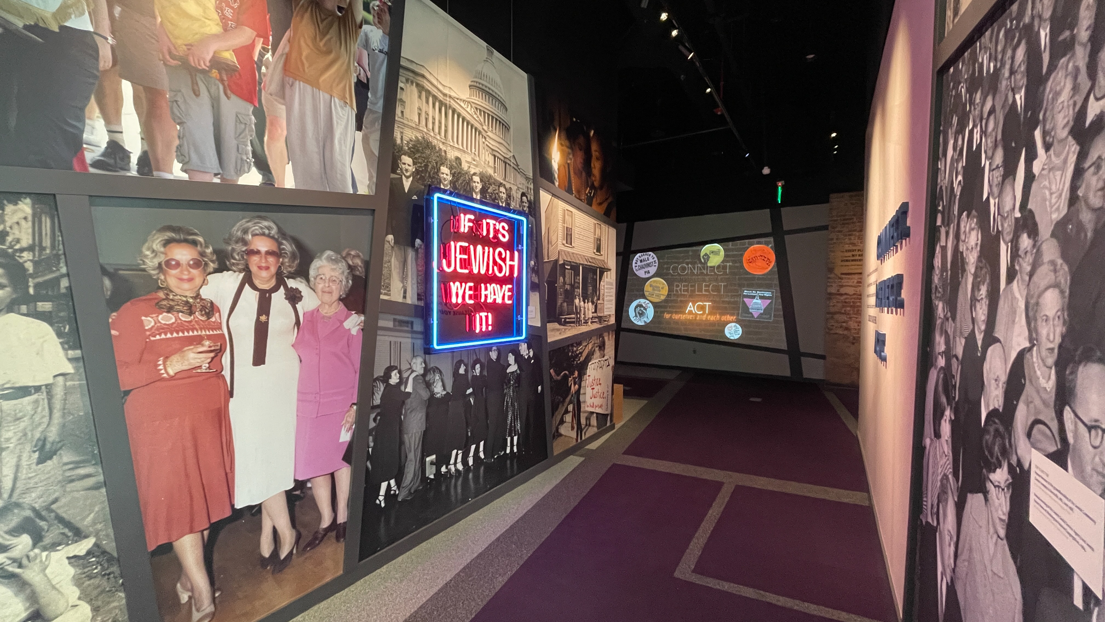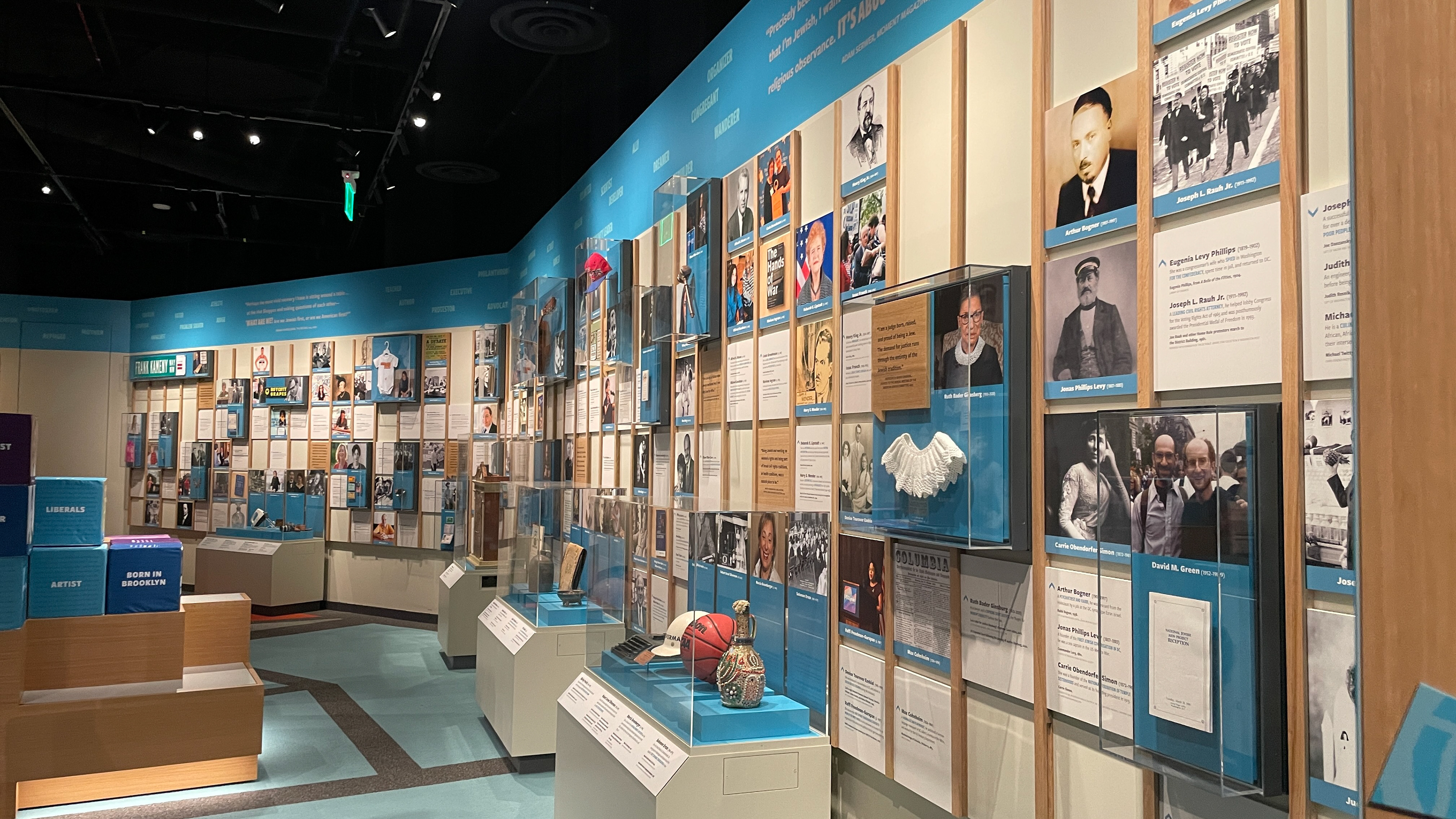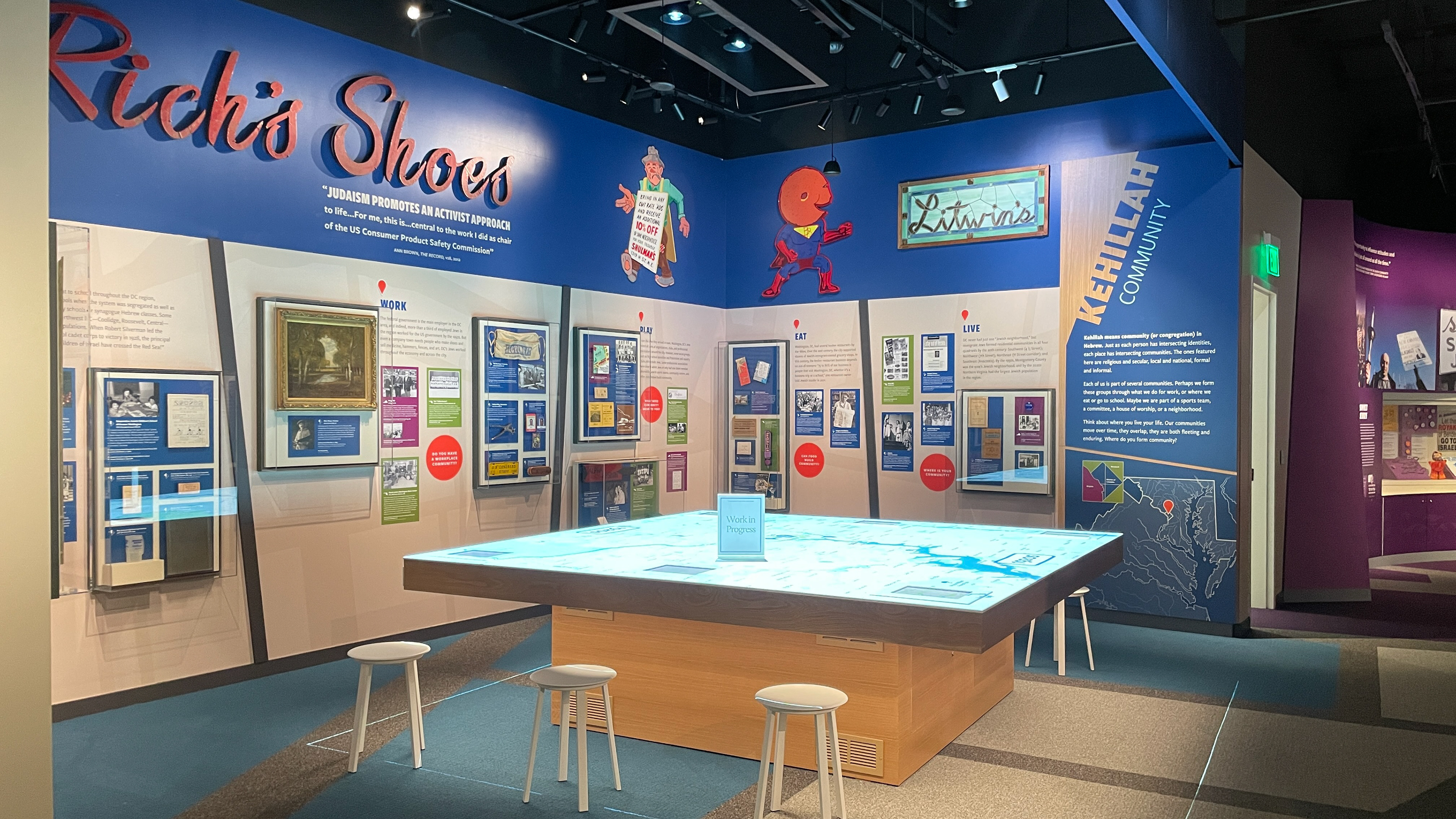 Categorized and color coded DC, Maryland and Virginia locations show the Jewish community across where they live, eat, play, work, learn and worship. This color coded system categorizes photographs, large artifact cases, quotes and questions within a small corner space to bring to life the intersectionality of the DC Jewish community across state delineations of the DMV (DC, Maryland and Virginia).