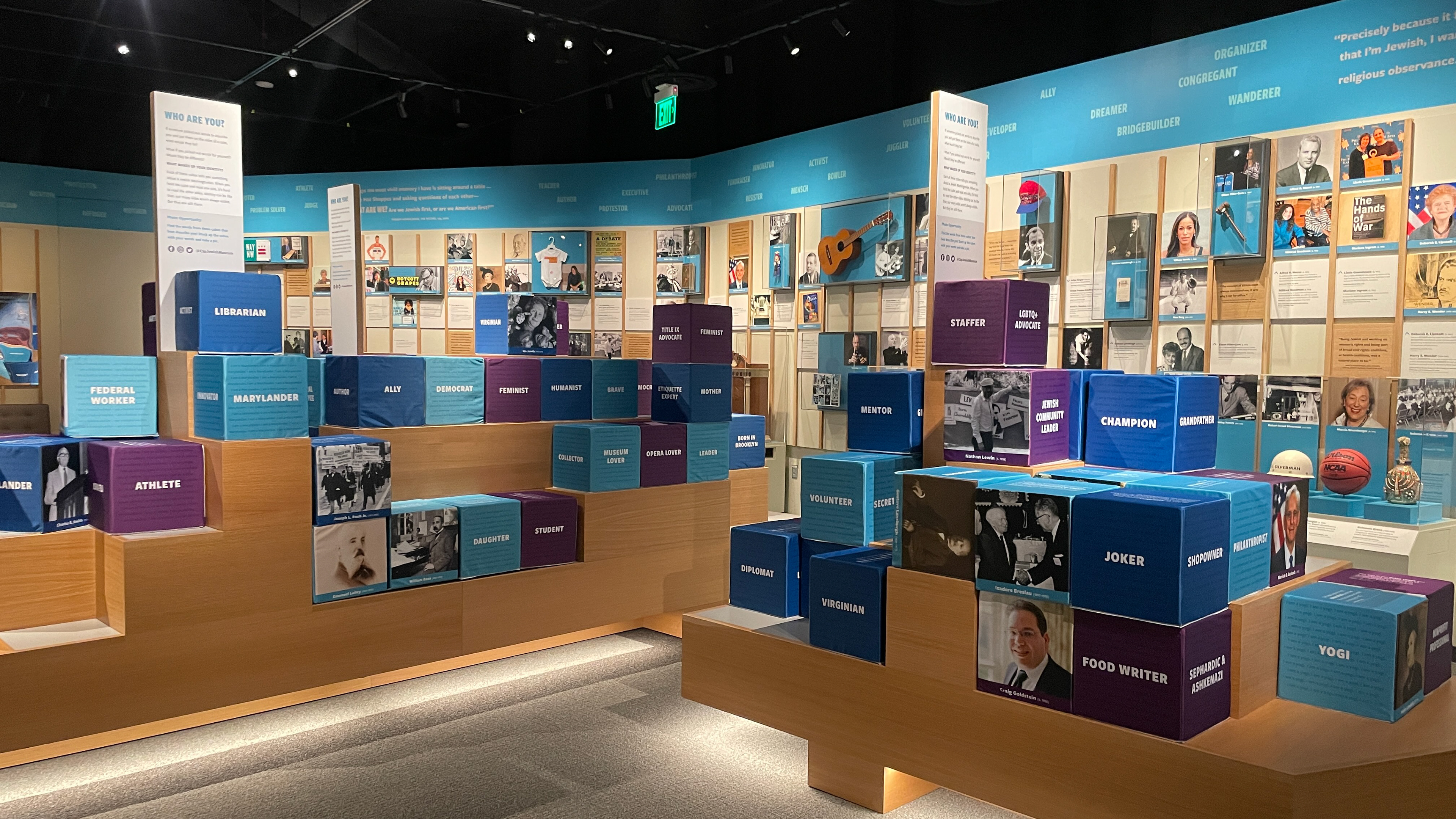 Gridded graphics span 100 DC Jews through history systematically interspersed with images, artifacts, quotes and captions. The caption design displays as many different jobs, genders, politics and races evenly throughout the wall to immediately show the breadth of what a DC Jew could look like. Foam cubes re-contextualize the wall grid to include three descriptive words for the visitor to pick up and connect with, tangibly and conceptually, adding dimensionality to these famous and non-famous figures alike.