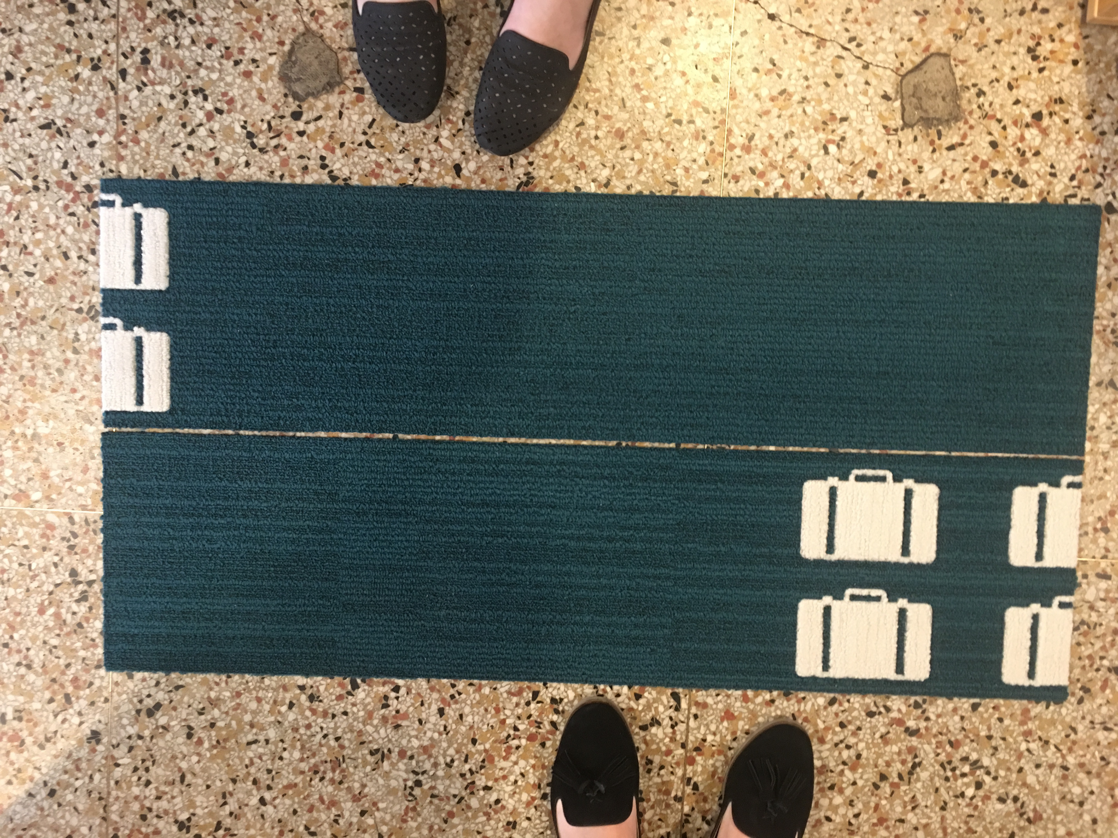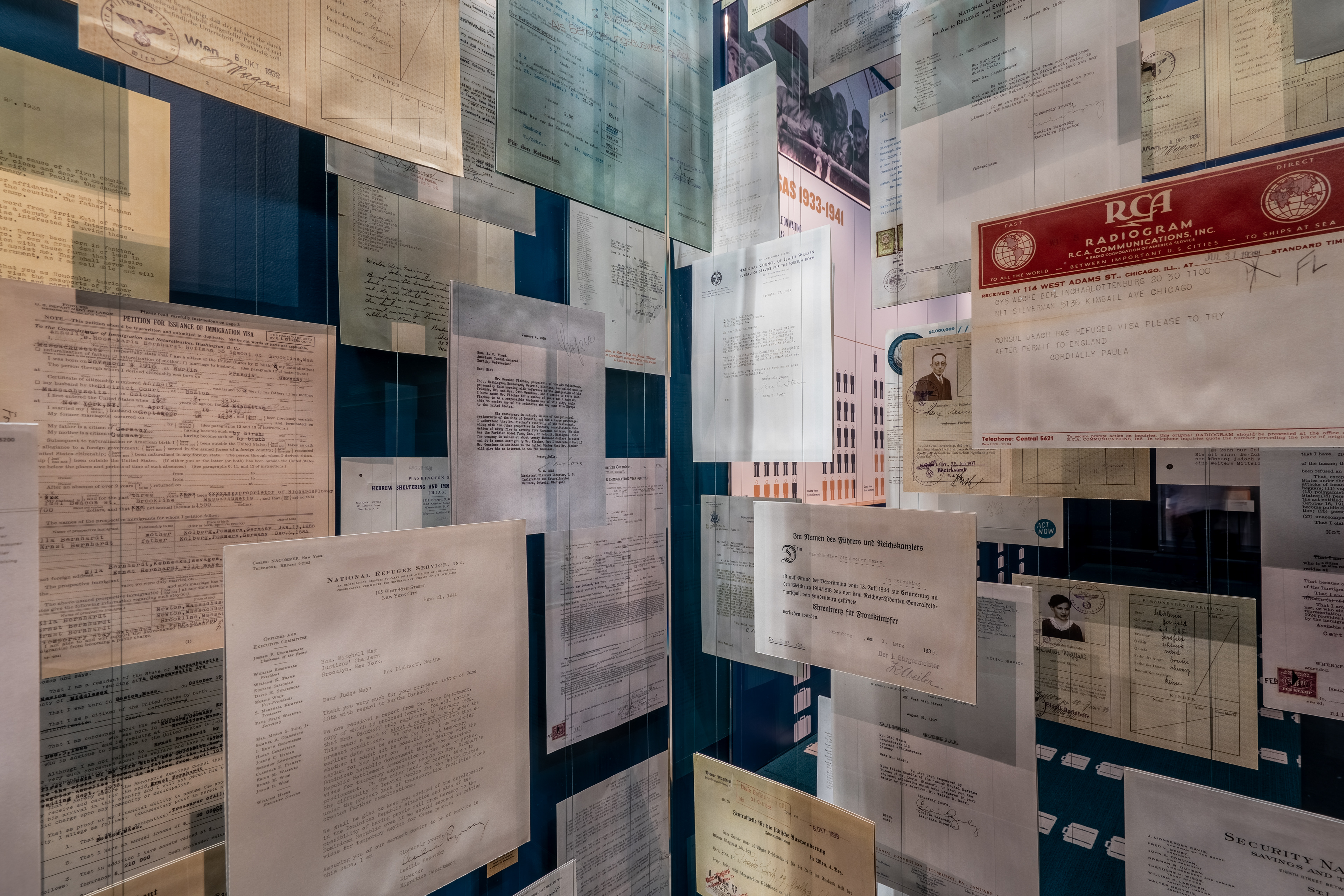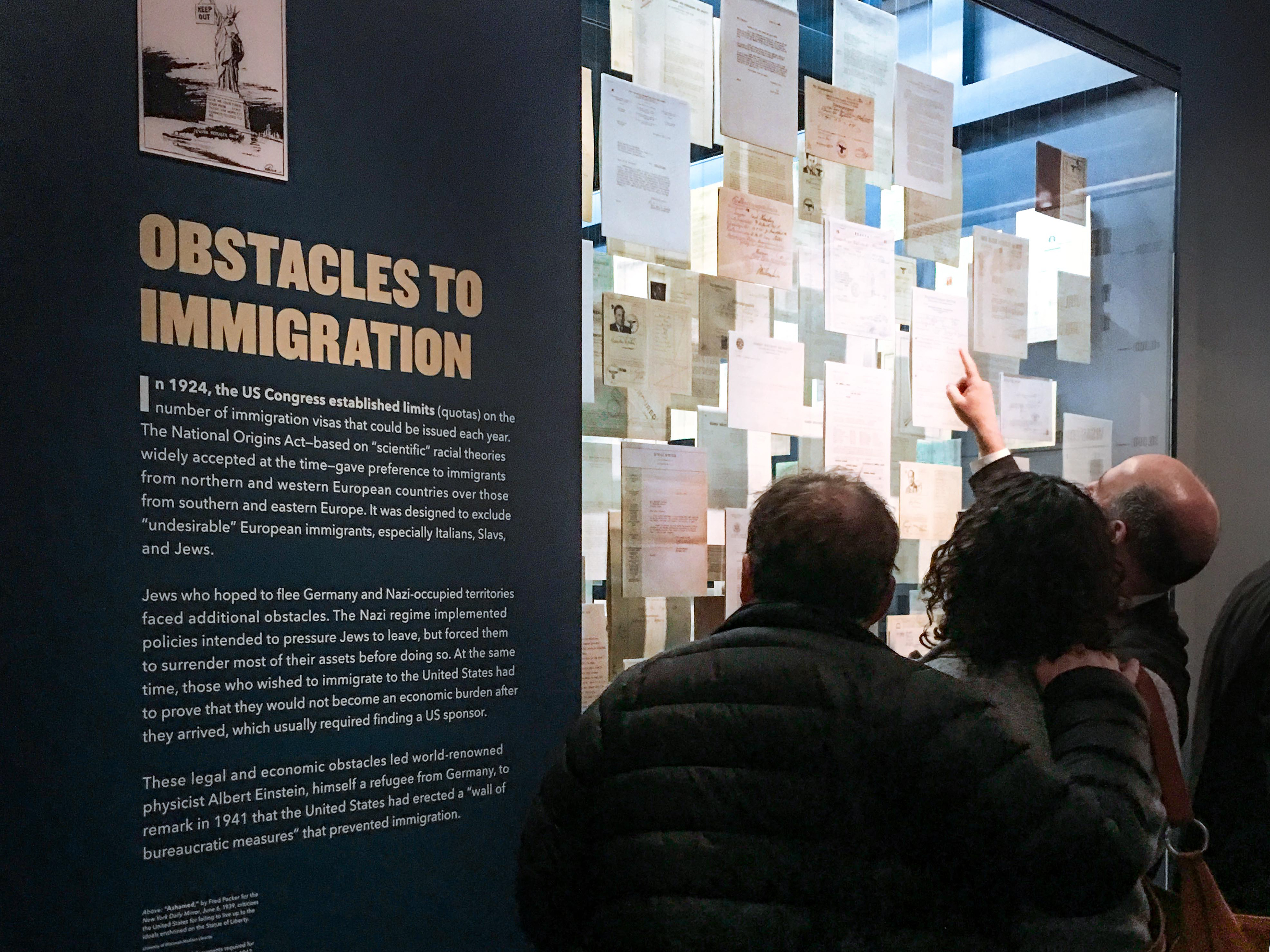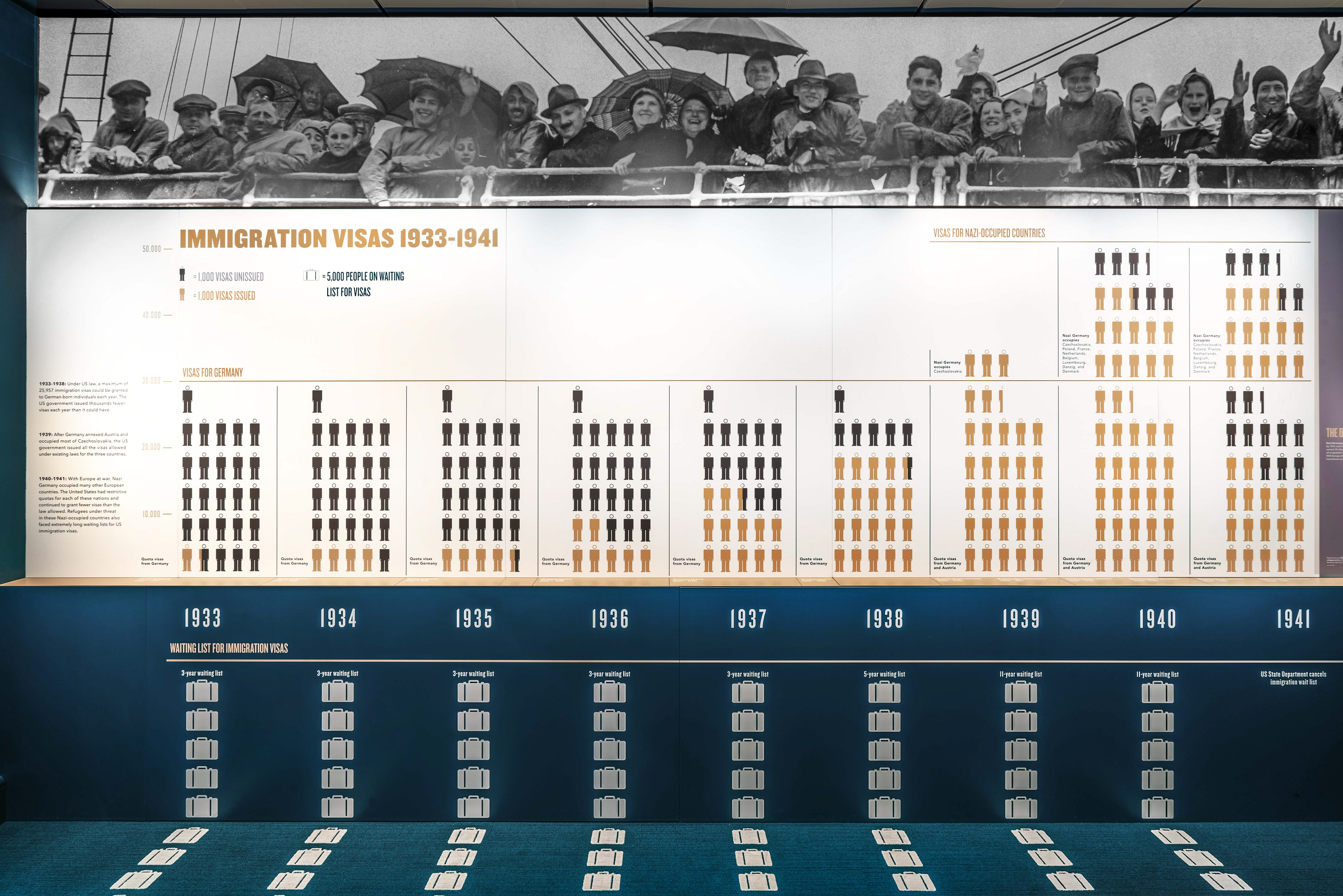 An infographic, spanning 75 ft of flooring and wall, explains the obstacles imposed on those refugees who were knowingly turned away from the freedom of America.